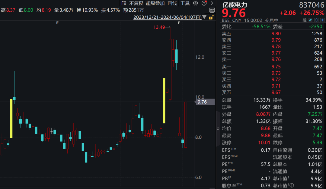 电气设备、虚拟电厂、特高压、绿色电力等板块跟随上扬。亿能电力飙涨26.75%,创历史新高(复权,下同),中瑞股份、*ST嘉寓等20%涨停,平高电气、保变电气、久盛电气等也批量涨停或涨超10%。