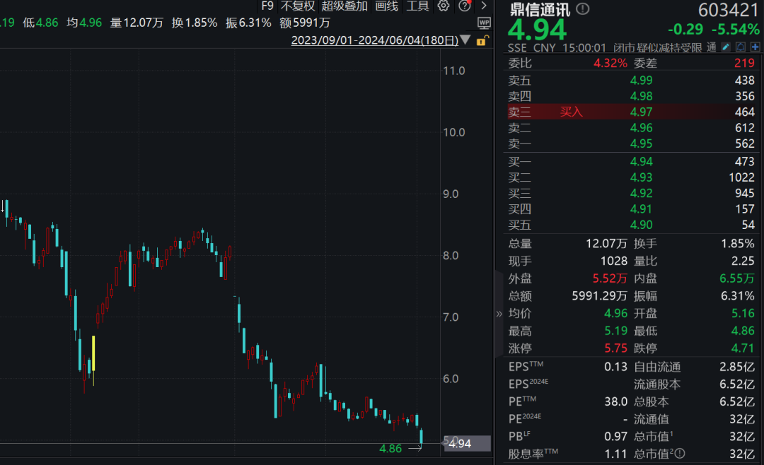 鼎信通讯称,上述处罚会在未来4—5年内导致公司营业收入合计下降约33亿元!其中,2024年会减少公司营业收入约5.5亿元。
