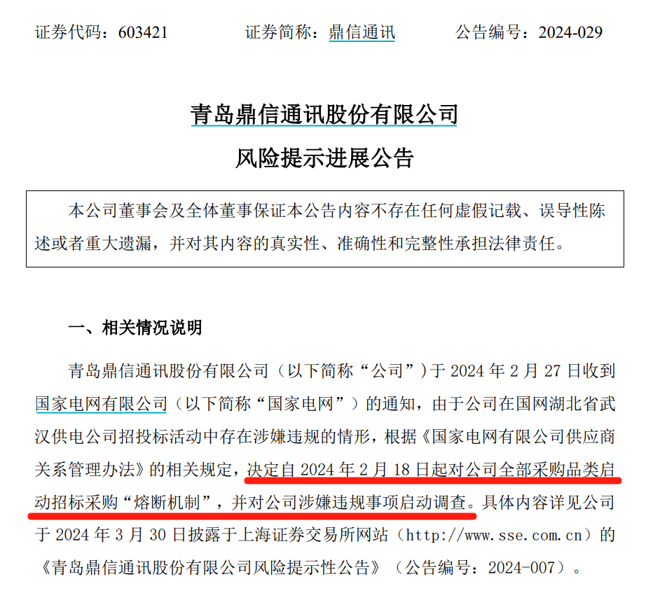 2月27日,鼎信通讯收到国家电网的通知,由于公司在国网湖北省武汉供电公司招投标活动中存在涉嫌违规的情形,根据《国家电网有限公司供应商关系管理办法》的相关规定,决定自2024年2月18日起对公司全部采购品类启动招标采购“熔断机制”,并对公司涉嫌违规事项启动调查。