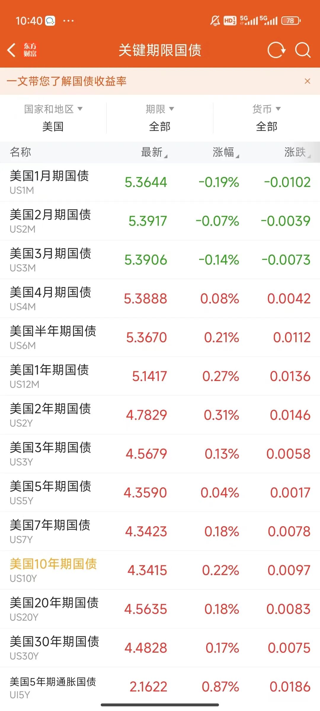 记者查询发现,6月5日,美国1月—30年国债利率普遍在2%—6%之间。另据中国债券信息网消息,5月31日美国国债收益率整体下行。具体来看,美国国债收益率曲线3M期限稳定在5.46%,3年期收益率下行5BP至4.69%,10年期收益率下行4BP至4.51%。