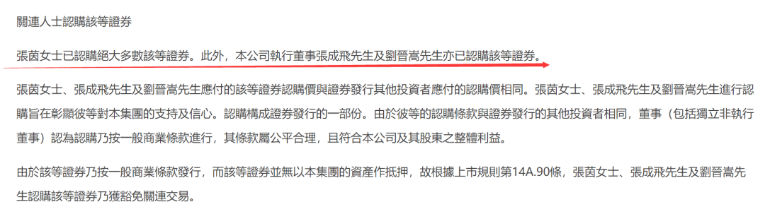 玖龙纸业公告称,张茵已认购绝大多数该等证券。此外,公司执行董事张成飞及刘晋嵩亦已认购该等证券。张茵为玖龙纸业实际控制人、董事长、执行董事,也是玖龙纸业创始人。