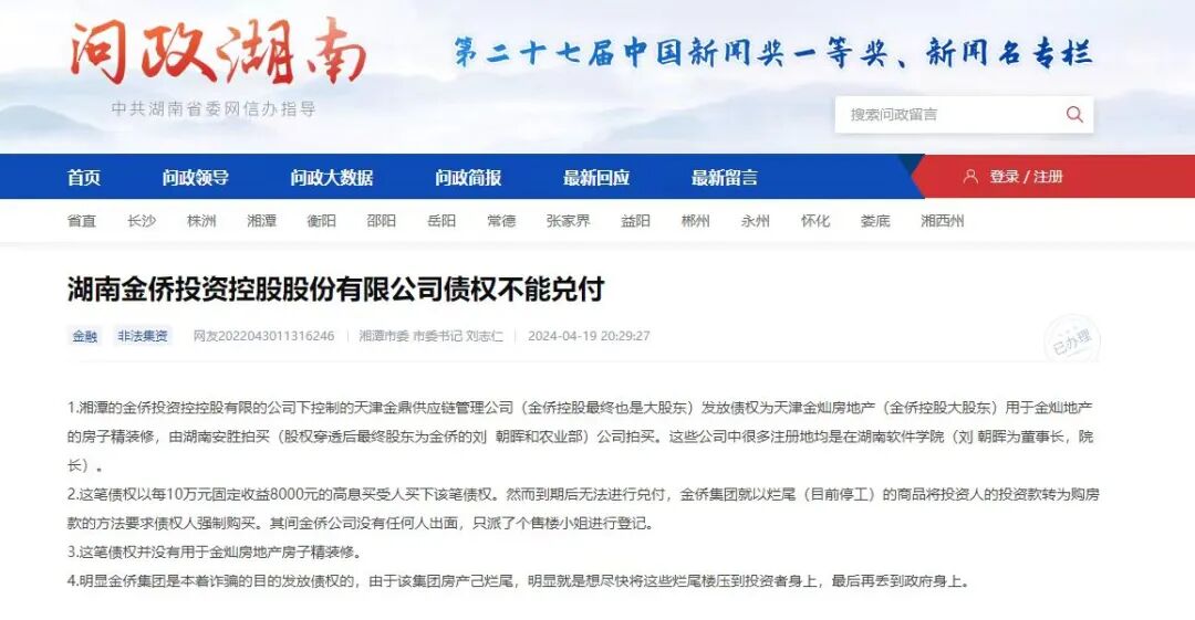 今年4月中旬,有网友在问政湖南上发文称,金侨控股债权不能兑付。文章表示,金侨控股控制的天津金鼎供应链发放债权为天津金灿房地产用于房子精装修,由湖南安胜拍买。这些公司中很多企业的注册地位于湖南软职。相关债权以每10万元固定收益8000元的利息由买受人买下,但到期后无法进行兑付。金侨控股提出将债权人的投资款转为购房款。