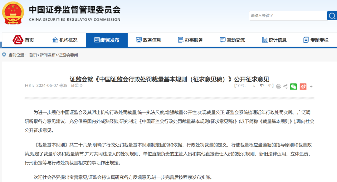 6月7日,证监会就《中国证监会行政处罚裁量基本规则(征求意见稿)》(下称《意见稿》)公开征求意见。这将是资本市场首套行政处罚裁量基准规则。