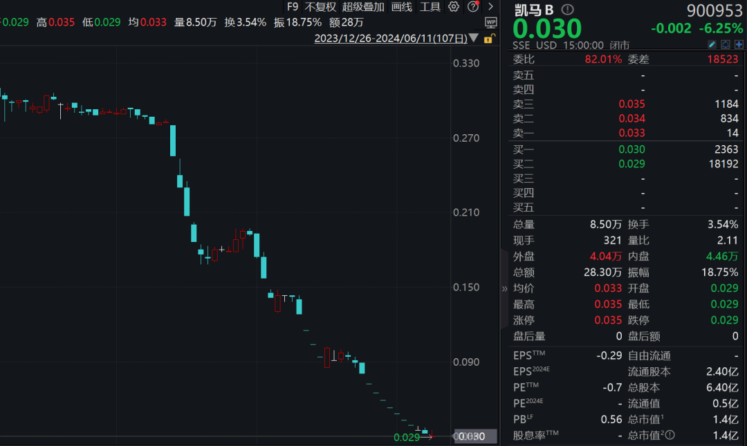截至昨天收盘,凯马B收于0.03美元/股,折合人民币为0.213元/股,公司总市值为9.7亿元人民币。
