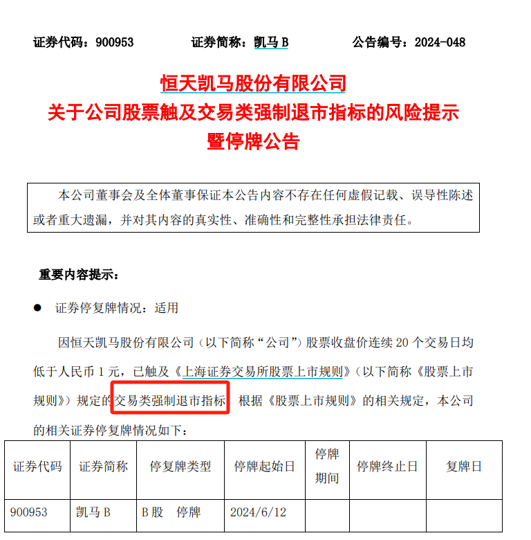 6月11日,上交所向凯马B下发《关于拟终止恒天凯马股份有限公司股票上市的事先告知书》(简称“《告知书》”),对凯马B股票作出终止上市的决定。