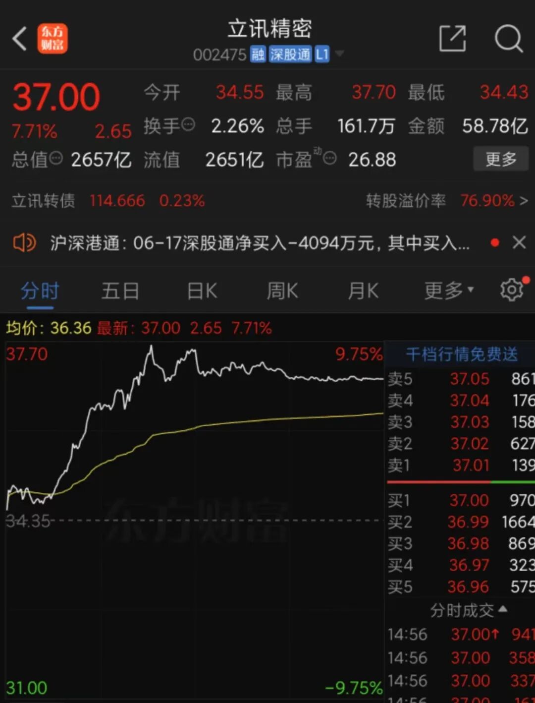 6月17日,立讯精密股价大涨7.71%,截至收盘报37元/股,总市值2657亿元。业内人士认为,股价大涨或与英特尔的入股有关。