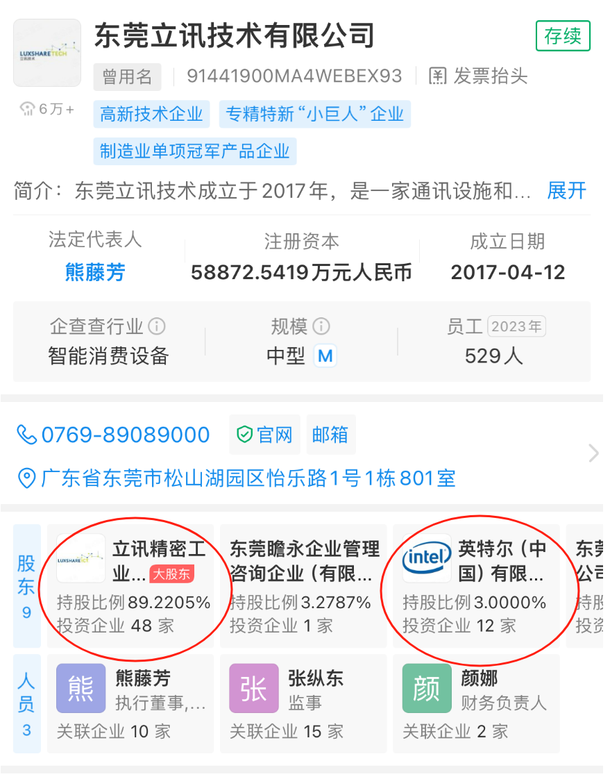 具体而言,6月17日,企查查APP显示,立讯精密旗下东莞立讯技术有限公司(下称“东莞立讯技术”)近日发生工商变更,股东新增英特尔(中国)有限公司,同时,注册资本由约5.71亿元人民币增至约5.89亿元人民币。