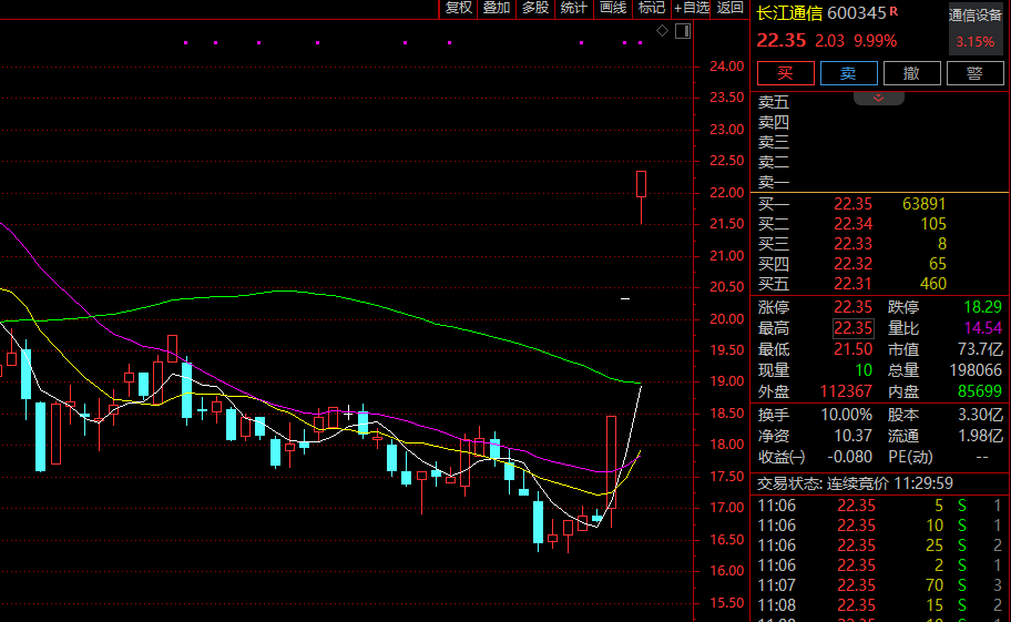 通信设备股早间继续走强,板块指数一度放量大涨逾3%,连续第6日上攻,距年内最高点仅一步之遥。板块内90%以上的个股飘红,其中长江通信开盘后仅约1分钟就直线涨停,连续第3日封板,瑞斯康达、金溢科技、铭普光磁等亦纷纷强势涨停。