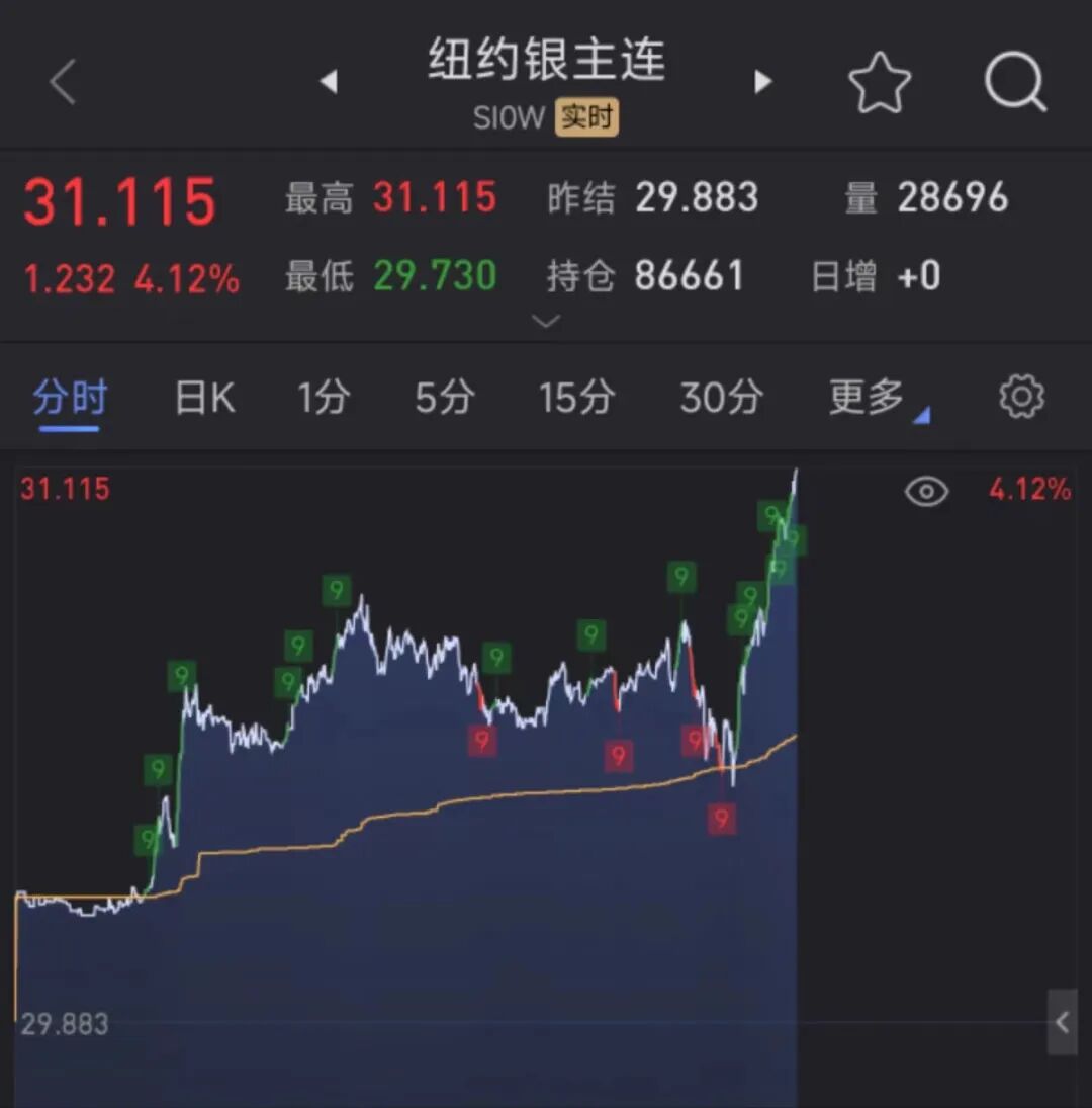 受外盘影响,国内黄金白银期货也飙涨。截至发稿,沪金主力合约、沪银主力合约分别报涨1.32%、2.87%。