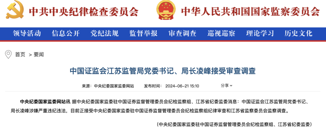 据中央纪委国家监委驻中国证券监督管理委员会纪检监察组、江苏省纪委监委消息:中国证监会江苏监管局党委书记、局长凌峰涉嫌严重违纪违法,目前正接受中央纪委国家监委驻中国证券监督管理委员会纪检监察组纪律审查和江苏省监察委员会监察调查。