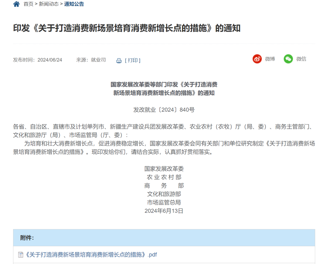 6月24日,国家发展改革委等部门印发《关于打造消费新场景培育消费新增长点的措施》(下称《措施》)的通知。