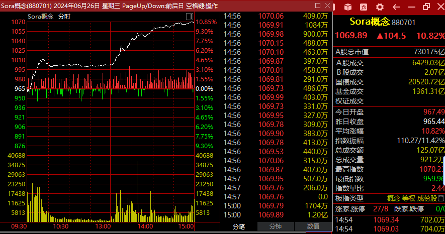 热点方面,人工智能股全线大涨,Sora概念指数罕见的飙涨10.82%,创该概念指数推出以来单日最大涨幅,一举收复此前1个星期的跌幅,成交量较昨日急剧增加200%以上。