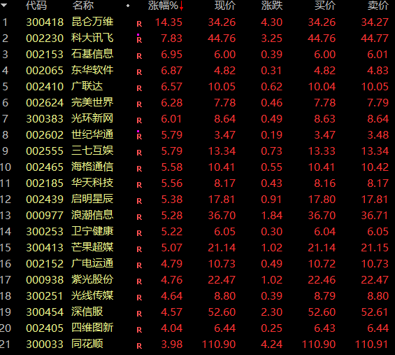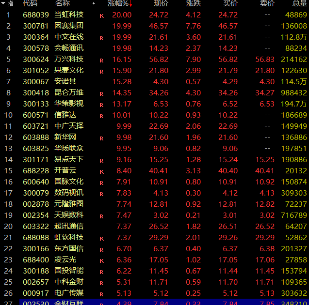 板块内所有个股上涨,当虹科技、因赛集团、中文在线、会畅通讯等批量20%涨停,半数以上概念股涨停或涨超10%。