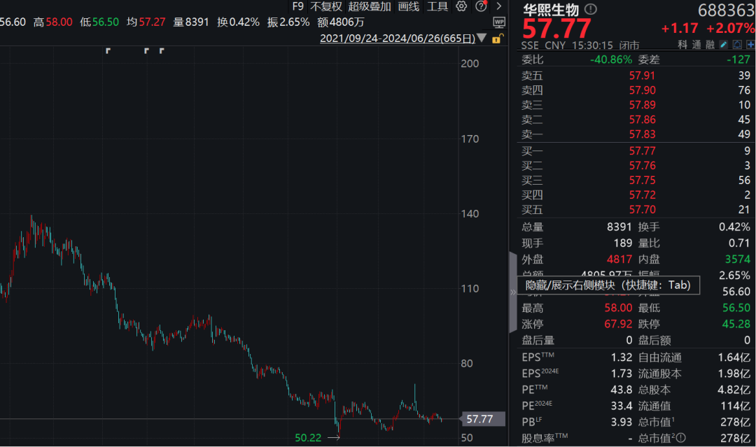 盘面数据显示,截至6月26日,华熙生物最新股价为57.77元/股,总市值278.3亿元。