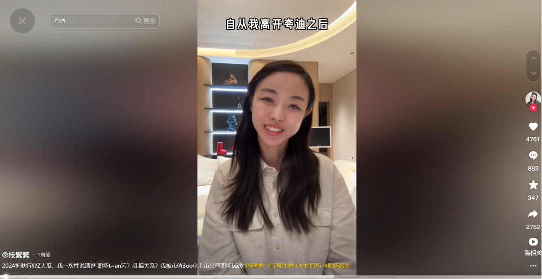 此外,6月16日,枝繁繁在小红书发布视频称,在离开夸迪后,受到行业内各种负面谣言的困扰,如“贪污被开除”“卷了代理商的钱跑路”“乱搞男女关系被开除”等。
