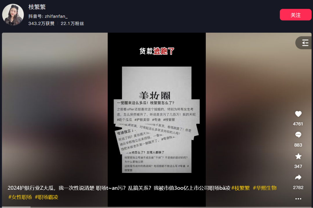 据了解,该事件源于华熙生物旗下子品牌夸迪的前主理人枝繁繁(程菲)在抖音、小红书上发布的视频爆料,自称遭遇职场霸凌和网暴。