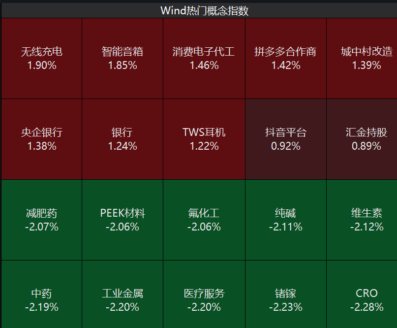 盘面上,消费电子、ST股、银行等板块涨幅居前,减肥药、工业金属、氟化工等概念板块跌幅居前。