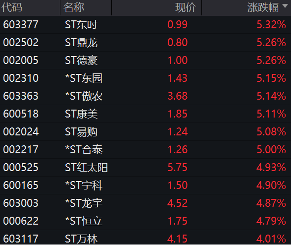 ST股早间逆势走强,板块指数放量高开高走涨逾1%。ST鼎龙、*ST东园、*ST傲农、*ST合泰等逾10股涨停或涨超5%。
