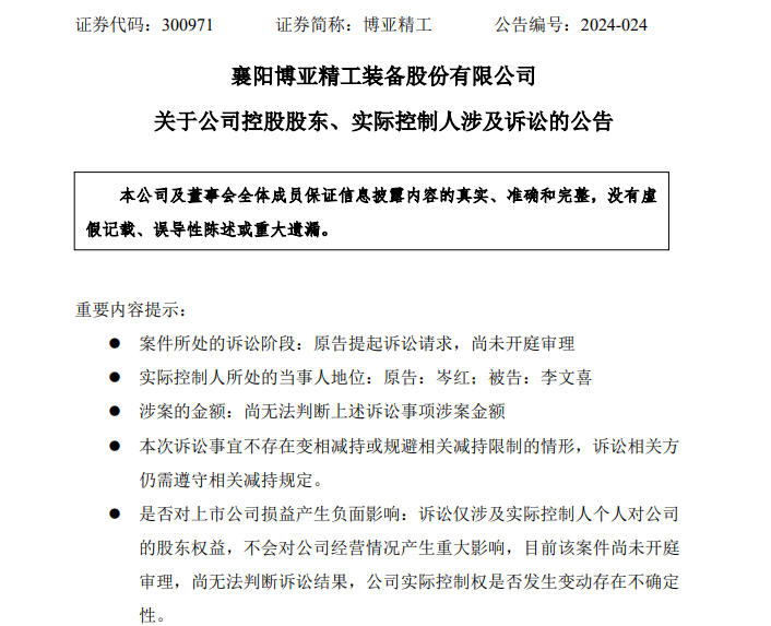 2022年1月博亚精工就曾公告,实控人李文喜近日收到《襄阳高新技术产业开发区人民法院应诉通知书》,原告岑红诉李文喜离婚纠纷案,由襄阳高新技术产业开发区人民法院于2022年1月10日立案,原告请求判令离婚并进行财产分割。