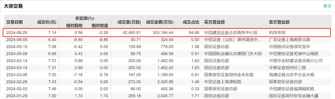 6月28日,大秦铁路大宗交易平台出现一笔成交,成交量4.25亿股,成交金额30.32亿元。这笔交易成交均价为7.14元,相对公司当日收盘价(7.16元/股)折价0.28%。
