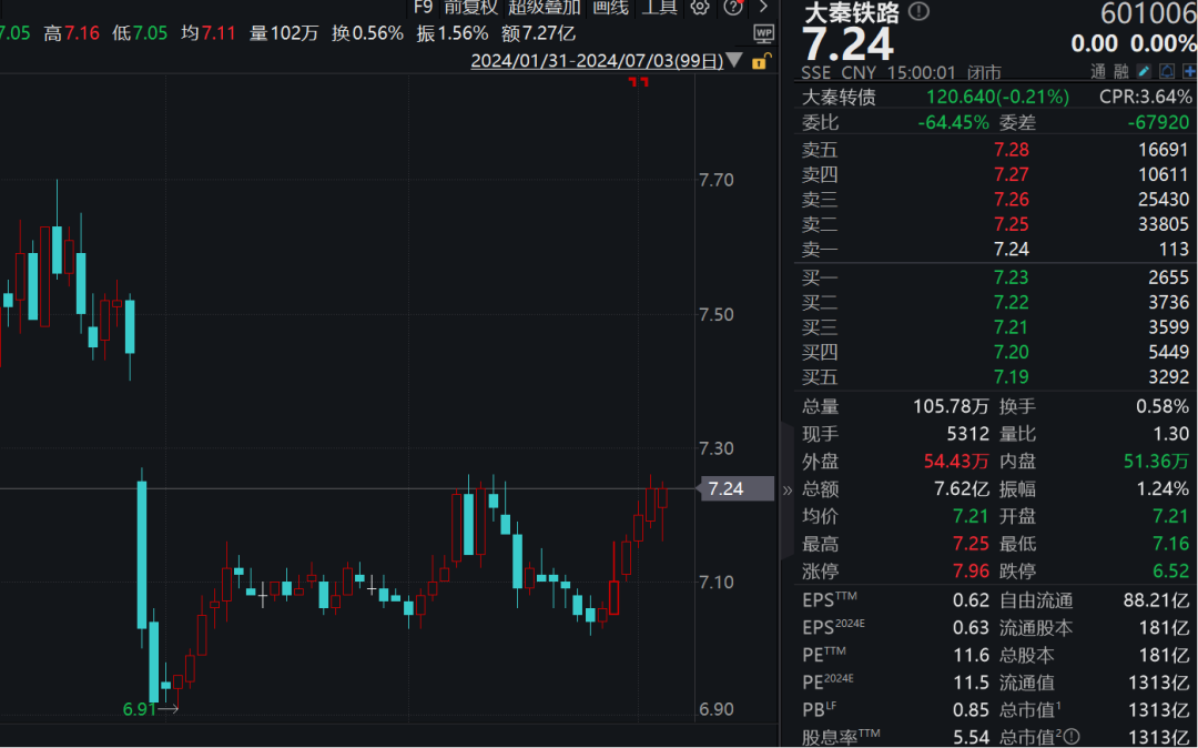 截至7月3日,大秦铁路最新收盘价为7.24元/股,总市值1313亿元。