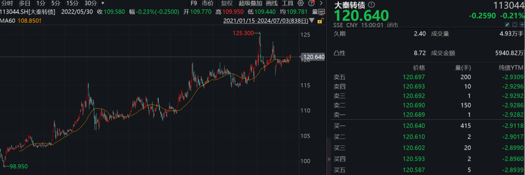 截至7月3日收盘,“大秦转债”报收于120.64元。以此估算,3001万张“大秦转债”市场价值约36.2亿元(加上其手上还有573.9万张可转债还未转股,实际持仓金额远不止于此)。