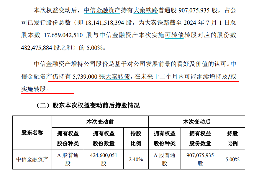 大秦铁路7月3日晚间披露,公司收到中国中信金融资产管理股份有限公司(下称“中信金融资产”,02799.HK)出具的《简式权益变动报告书》。