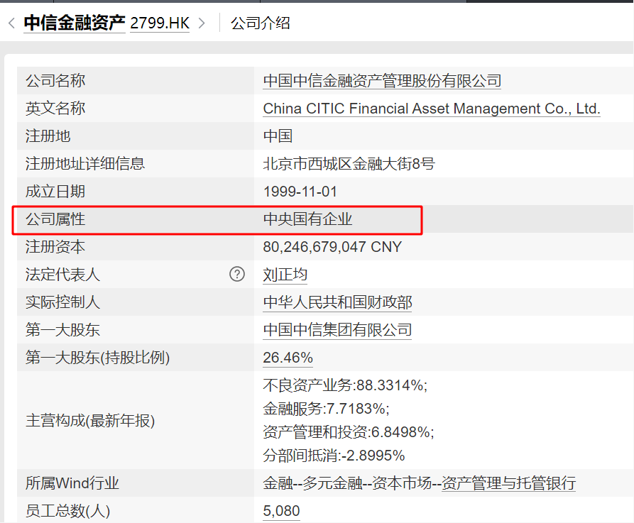 2015年10月30日,公司在中国香港联交所主板上市。今年1月,公司更名为中信金融资产。目前,公司主要股东包括中信集团、财政部、中保融信私募基金、中国人寿保险(集团)公司等,公司属于中央国有企业。