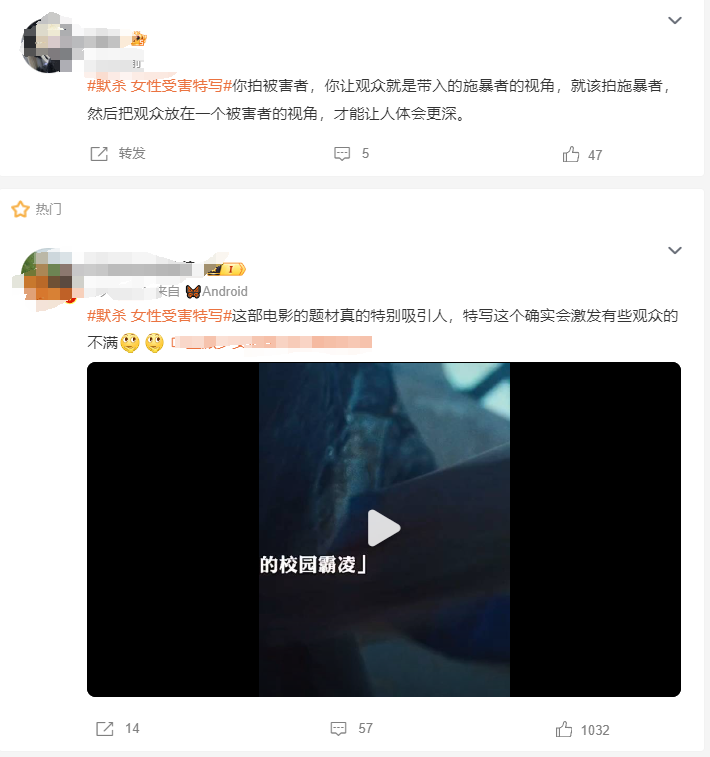 引发感慨的是新上映的电影《默杀》。今日,微博热搜前10出现两条有关电影《默杀》的内容,其中有关“女性受害特写”的一些镜头引发争议。