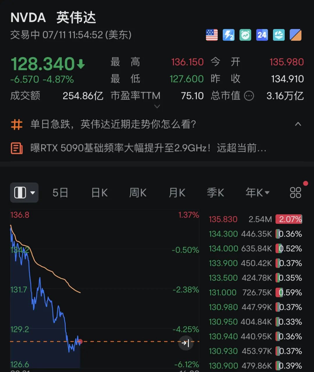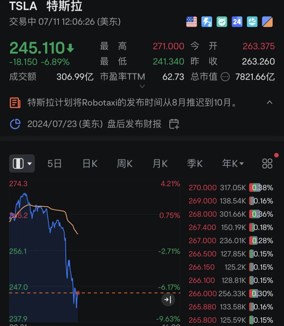 连涨多日的特斯拉出现跳水走势。