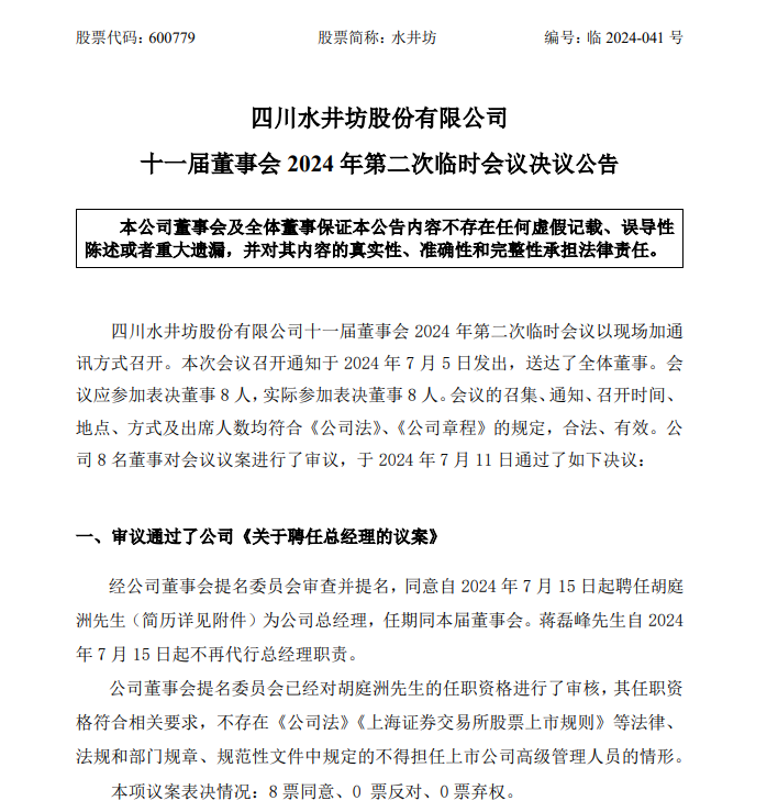 7月13日晚间,水井坊发布最新公告,经上市公司董事会提名委员会审查并提名,同意自7月15日起聘任胡庭洲为水井坊总经理,并提名为董事候选人,任期同本届董事会。水井坊董事会提名委员会已经对胡庭洲的任职资格进行了审核,其任职资格符合相关要求,同时蒋磊峰自7月15日起不再代行总经理职责。8月2日,水井坊将召开临时股东大会,对选举胡庭洲为董事的议案进行审议、表决。