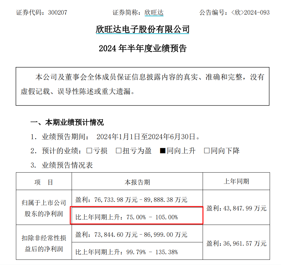 同时,欣旺达还发布了业绩预告:预计上半年净利润7.67亿元—8.99亿元,同比增长75%—105%。