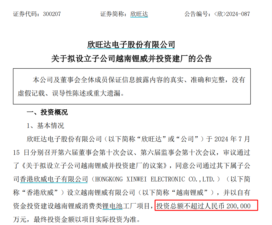 公告显示,欣旺达将通过下属香港子公司设立越南锂威有限公司作为项目实施主体。