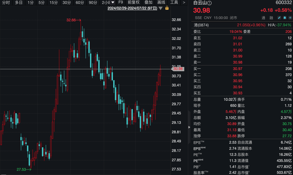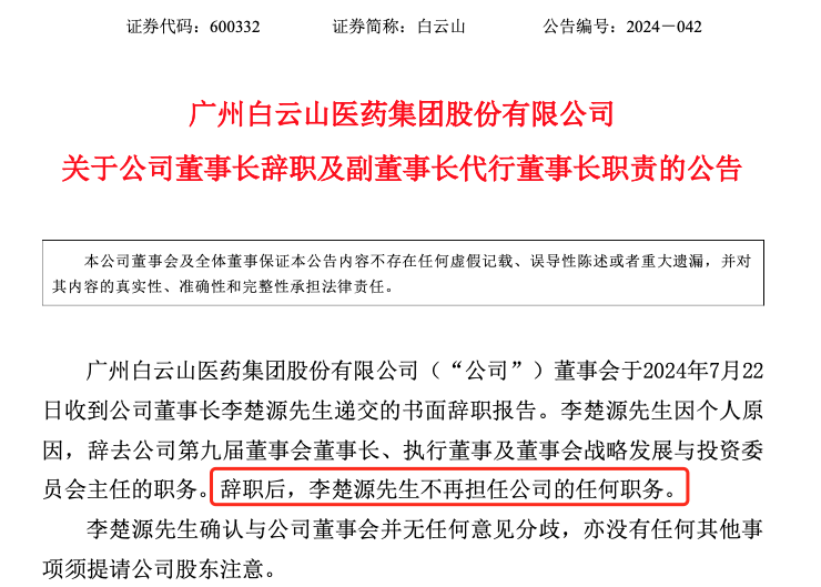 7月22日晚间,白云山(600332)发布公告,公司于当日收到董事长李楚源的书面辞职报告。