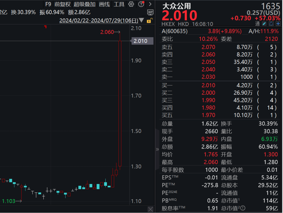 大众公用AH股联袂大涨,A股今日高开后秒速涨停,连续第3日封板,股价创2年多来新高。H股则暴涨逾55%,创近3年来新高,成交量较前一交易日激增10倍以上。