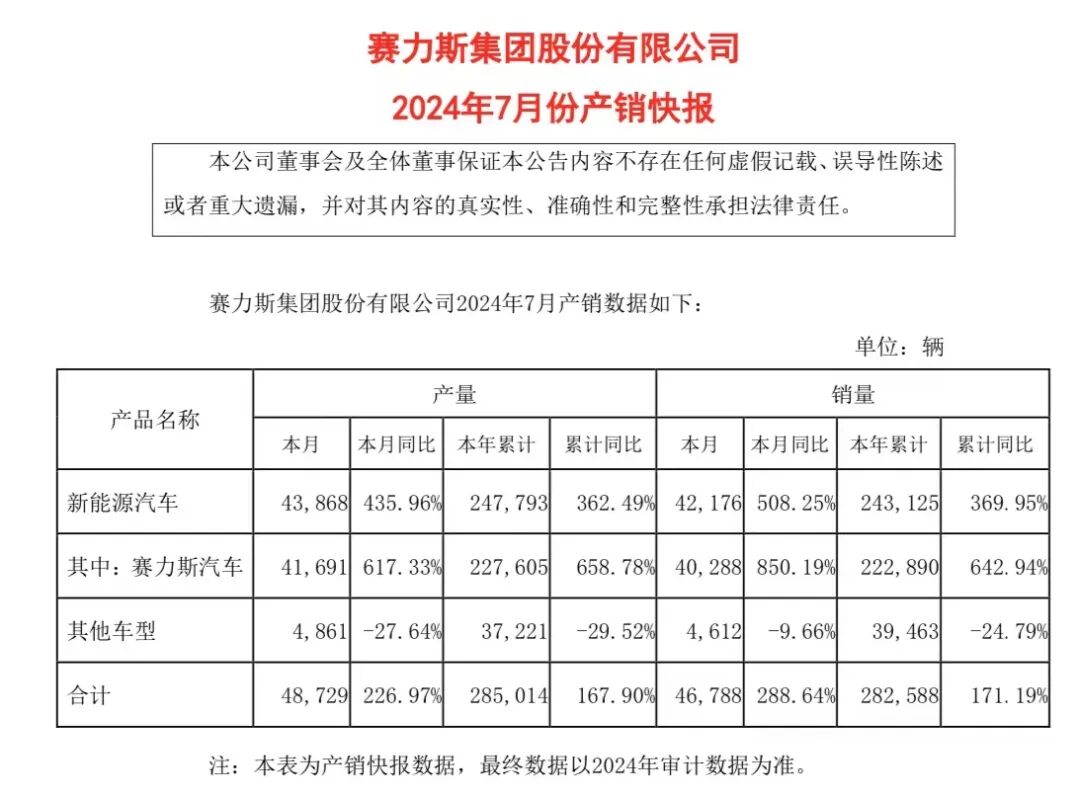 另外,赛力斯7月销量增长明显。据披露,赛力斯7月份新能源汽车销量为42176辆,同比增长508.25%;其中赛力斯汽车销量为40288辆,同比增长850.19%。