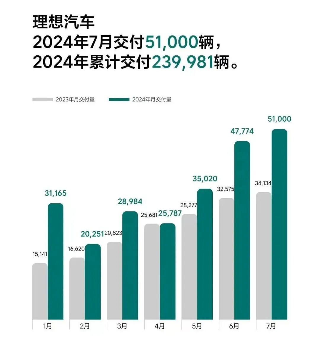 理想汽车7月交付新车51000辆,创月交付量的历史新高。