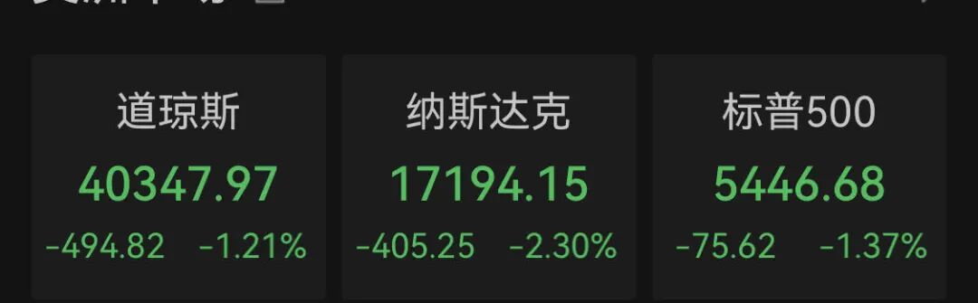 道指收跌494.82点,跌幅1.21%,报40347.97点。纳指收跌405.25点,跌幅2.30%,报17194.15点。