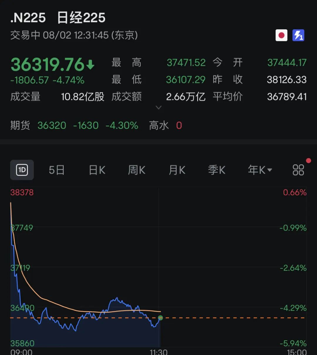 日经225指数盘中一度暴跌超2000点,跌幅超5%,创近半年来新低,自7月10日见顶以来,在不到1个月的时间里最多跌去逾6300点,累计跌幅近15%。