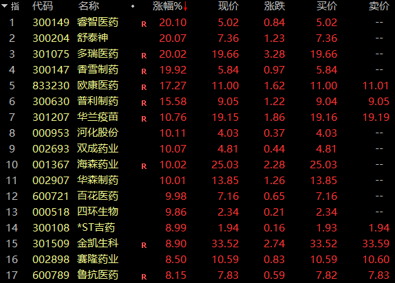 减肥药、创新药、肝炎概念、免疫治理等也纷纷大涨,舒泰神、多瑞医药等多股20%涨停,河化股份、双成药业、海森药业等也批量封板。