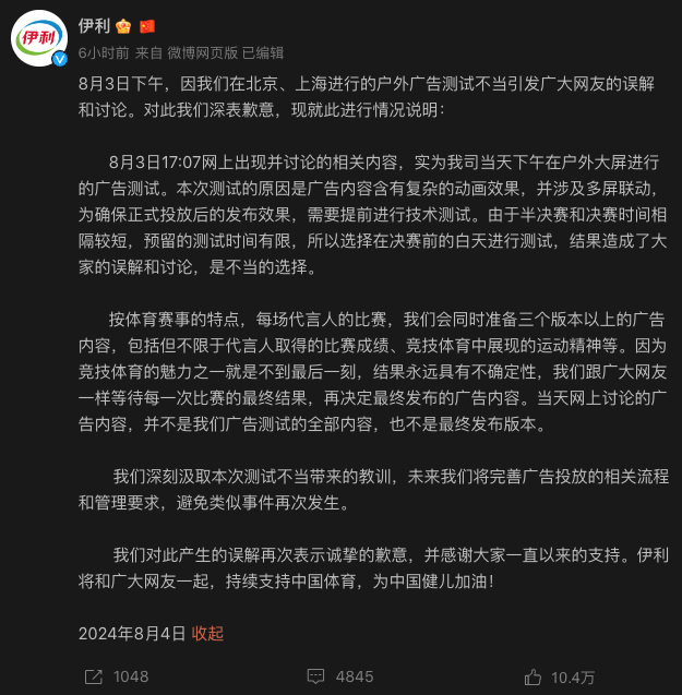 我们对此产生的误解再次表示诚挚的歉意,并感谢大家一直以来的支持。伊利将和广大网友一起,持续支持中国体育,为中国健儿加油!