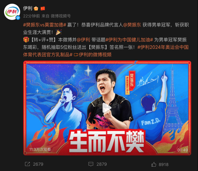 比赛结果和伊利上图广告相符。很快,伊利在微博中发文表示祝贺。