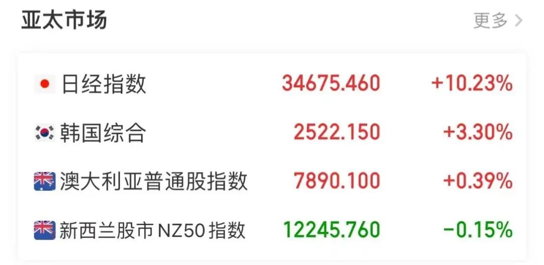 周一暴跌后,周二日经225指数开盘直线拉升,当日涨幅达10.23%,向上触发熔断,韩国KOSPI指数也大幅拉升,涨3.3%。