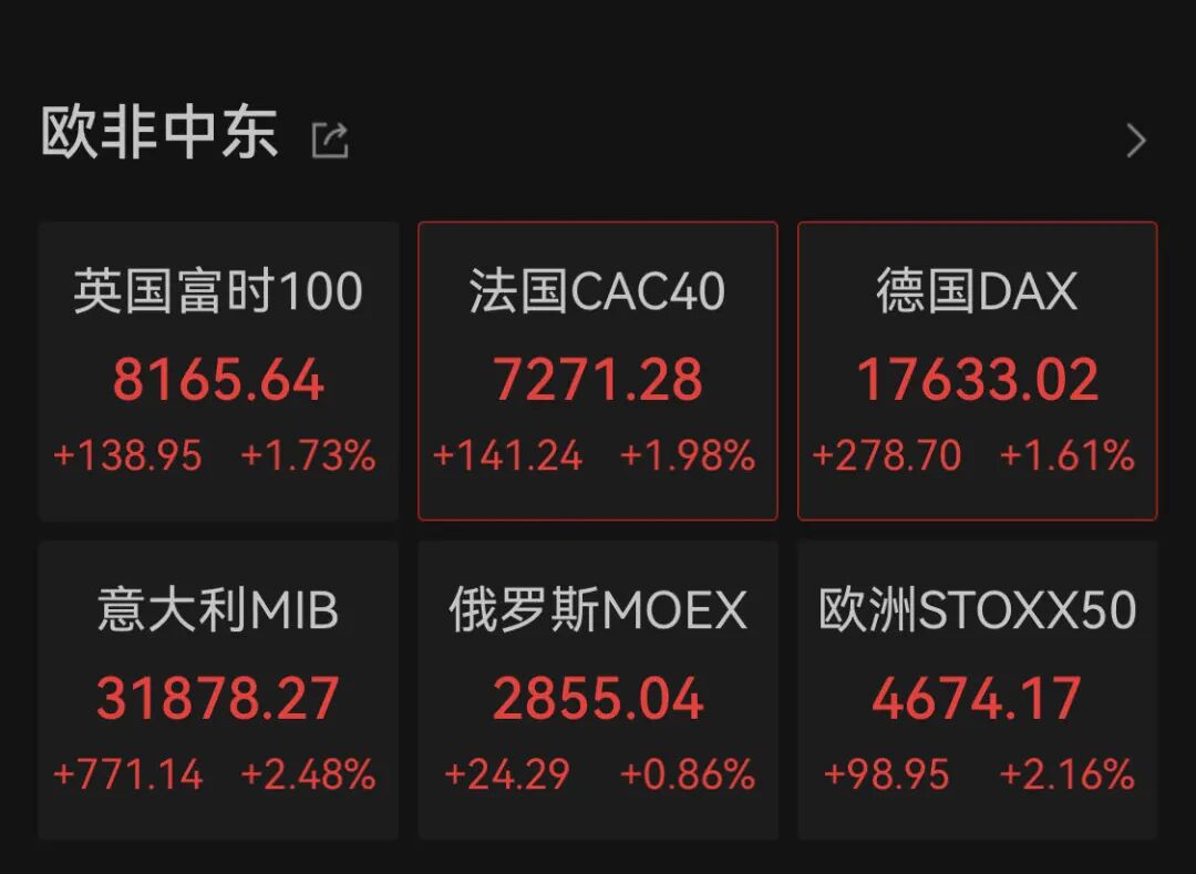 欧洲方面,英、法、德三国股指也纷纷大涨。