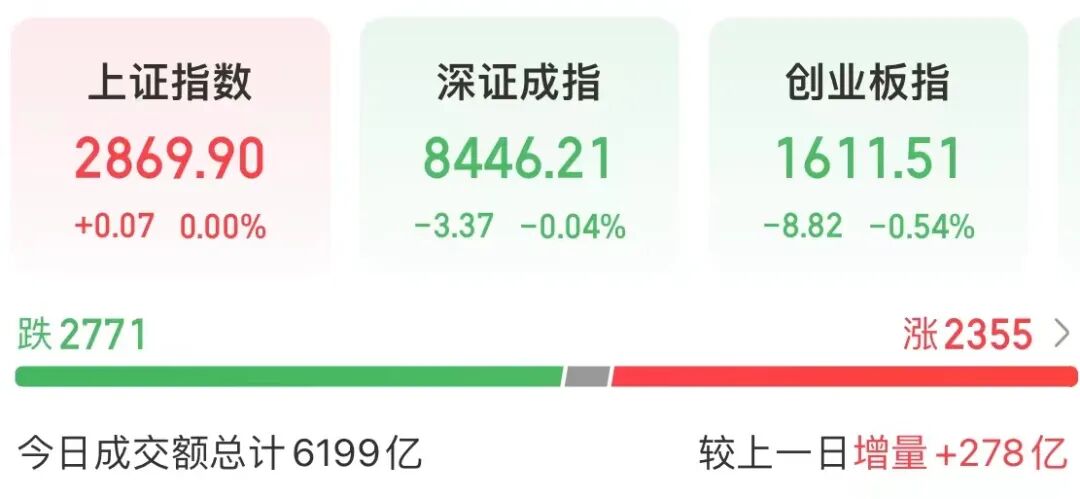 截至收盘,沪指涨0.07点,报2869.90点,深成指跌0.04%,报8446.21点,创业板指跌0.54%,报1611.51点。