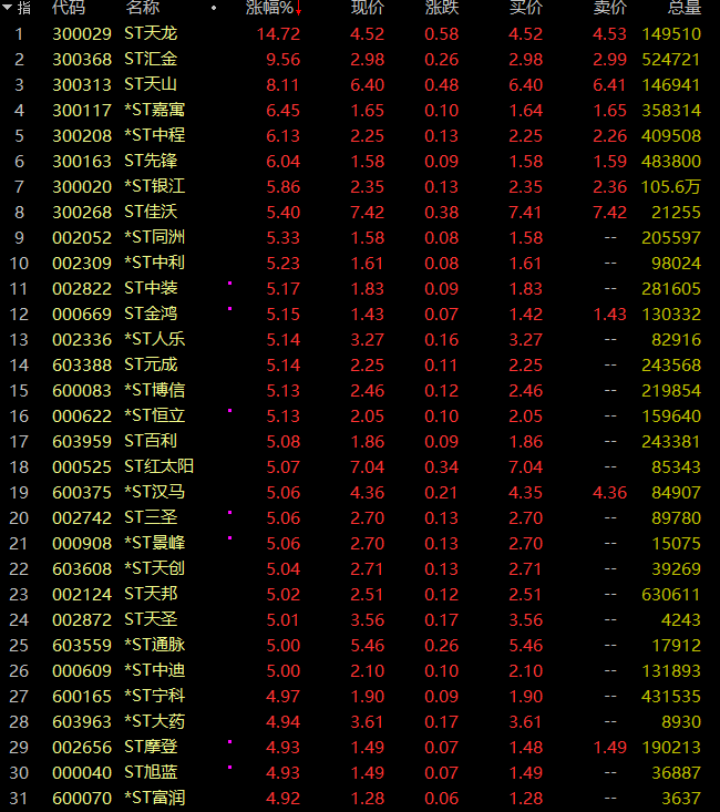 ST板块午后活跃,*ST景峰走出9连板,9天累计涨幅达56.07%,目前该股27天26板;ST百利、ST三圣、ST天邦、ST中装等20余股涨停。
