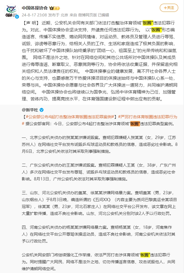 以“饭圈”形态编造谣言、传播不实信息、煽动网民情绪,对运动员、教练员及管理人员进行辱骂、诋毁、诽谤等恶意行为,给相关人员的工作、生活和家庭造成了极其负面的影响,也干扰和破坏了中国体操队始终秉承的“团结一心、祖国至上”的光荣传统和和谐氛围。