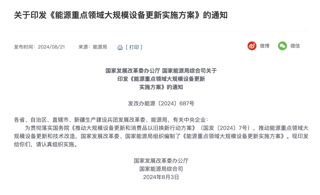 8月21日消息,国家发展改革委办公厅、国家能源局综合司印发《能源重点领域大规模设备更新实施方案》(以下简称《实施方案》)。