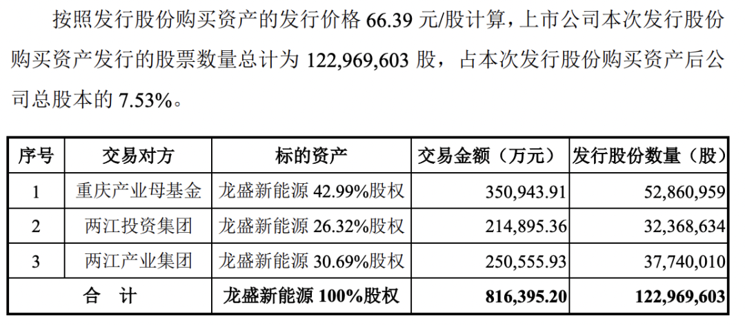 按照发行股份购买资产的发行价格66.39元/股计算,上市公司本次发行股份购买资产发行的股票数量总计为1.23亿股,占本次发行股份购买资产后公司总股本的 7.53%。上市公司就购买标的资产应向重庆产业母基金、两江投资集团、两江产业集团支付的对价股份的数量分别为5286.1万股、3236.86万股和3774万股。发行数量最终以中国证监会同意注册的数量为准。