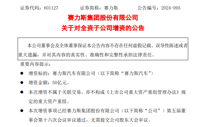 公告显示,为增强赛力斯汽车的资本实力,满足其可持续高质量发展需要,赛力斯拟以自有资金向赛力斯汽车增资50亿元,完成增资后,赛力斯汽车的注册资本为99.6亿元,仍为公司全资子公司。